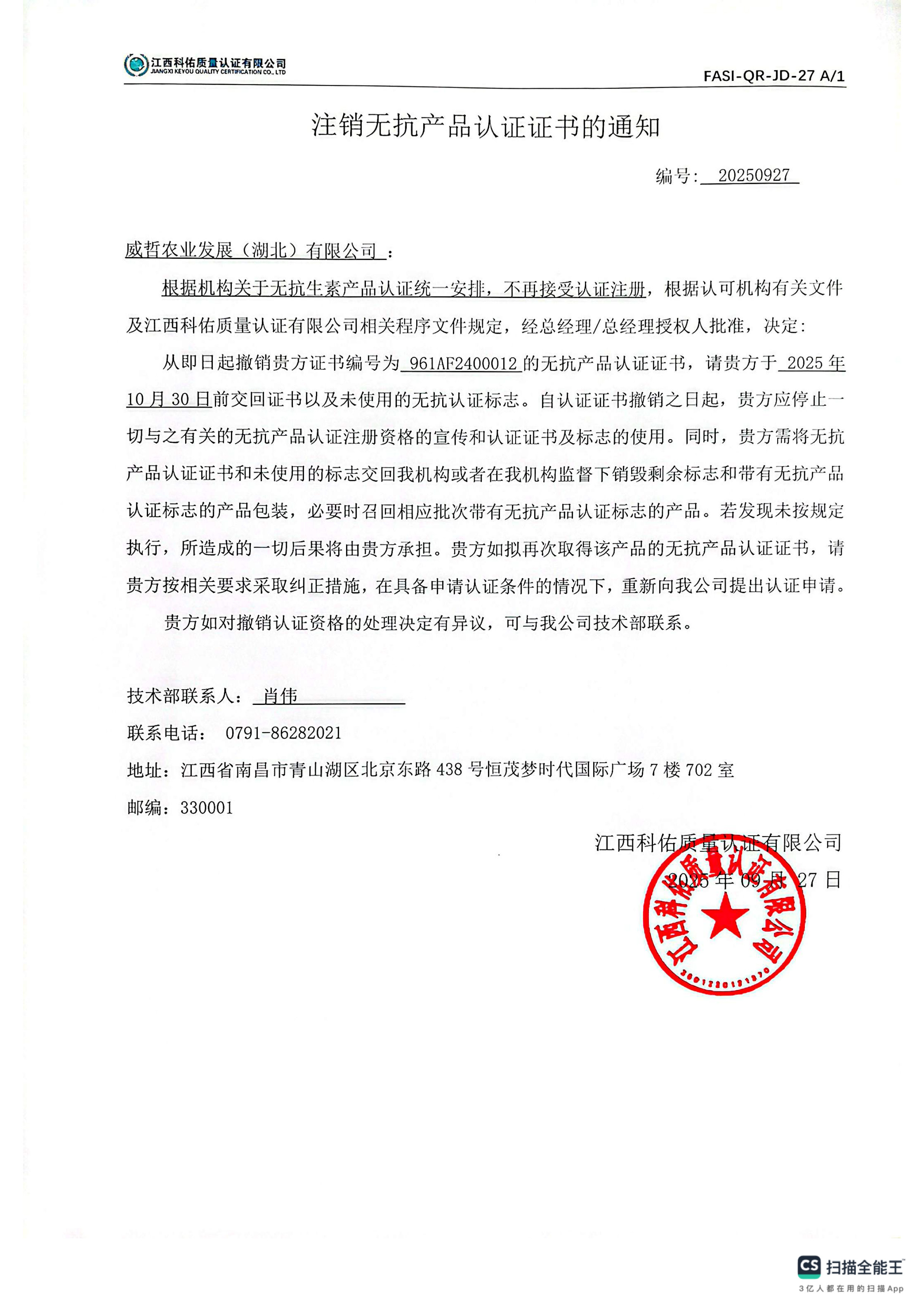 威哲农业发展(湖北)有限公司 无抗证书注销