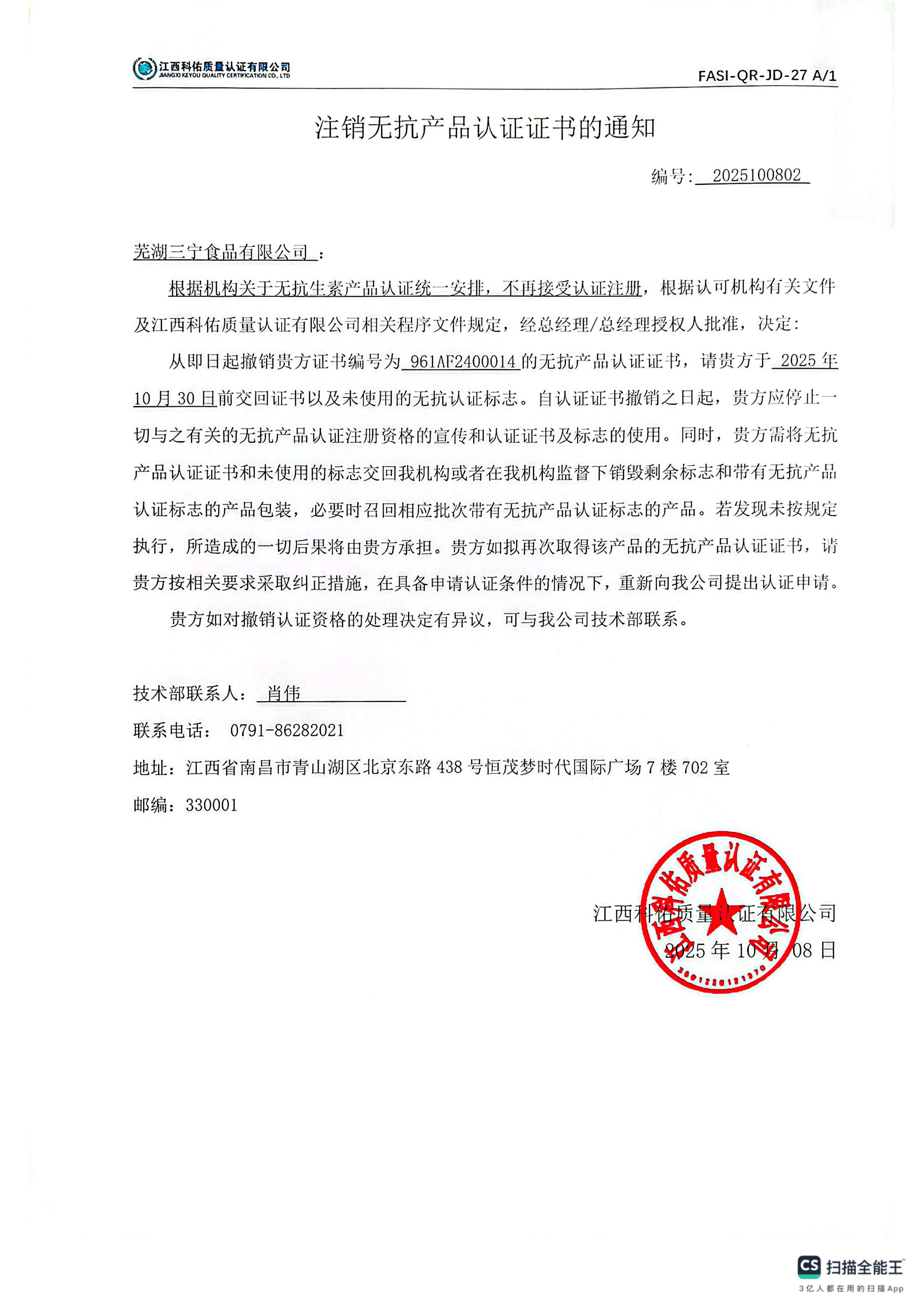 芜湖三宁食品有限公司 无抗证书注销