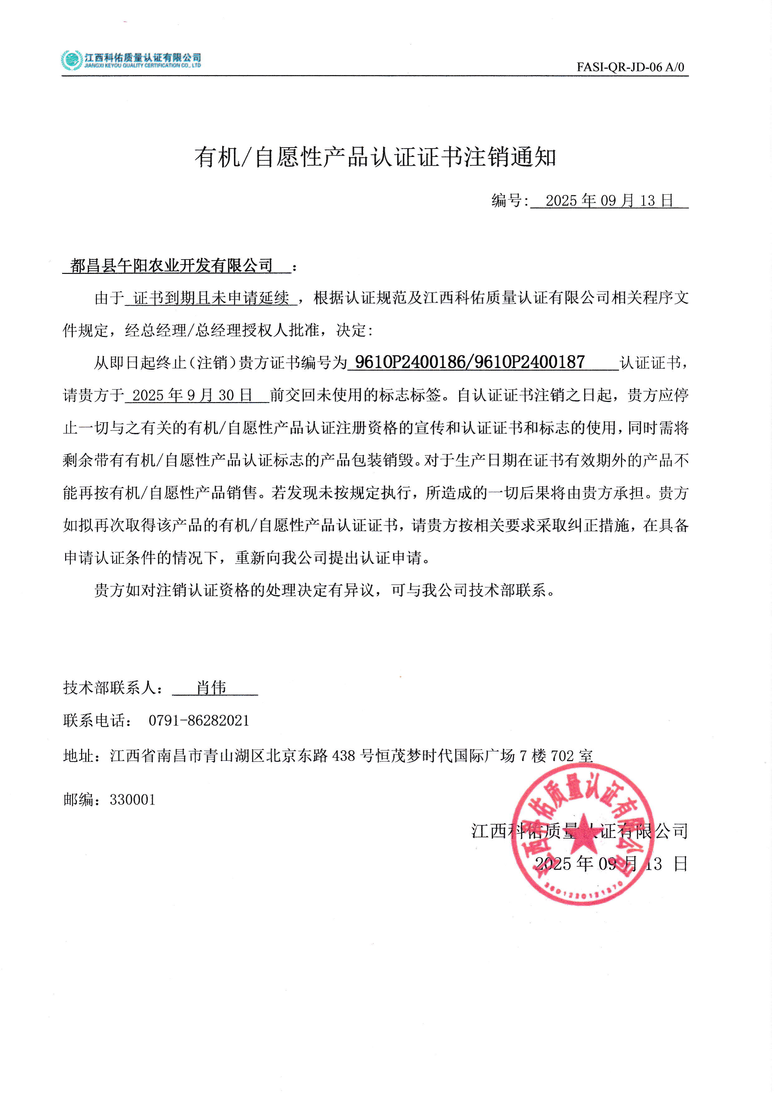 都昌县午阳农业开发有限公司 有机证书注销