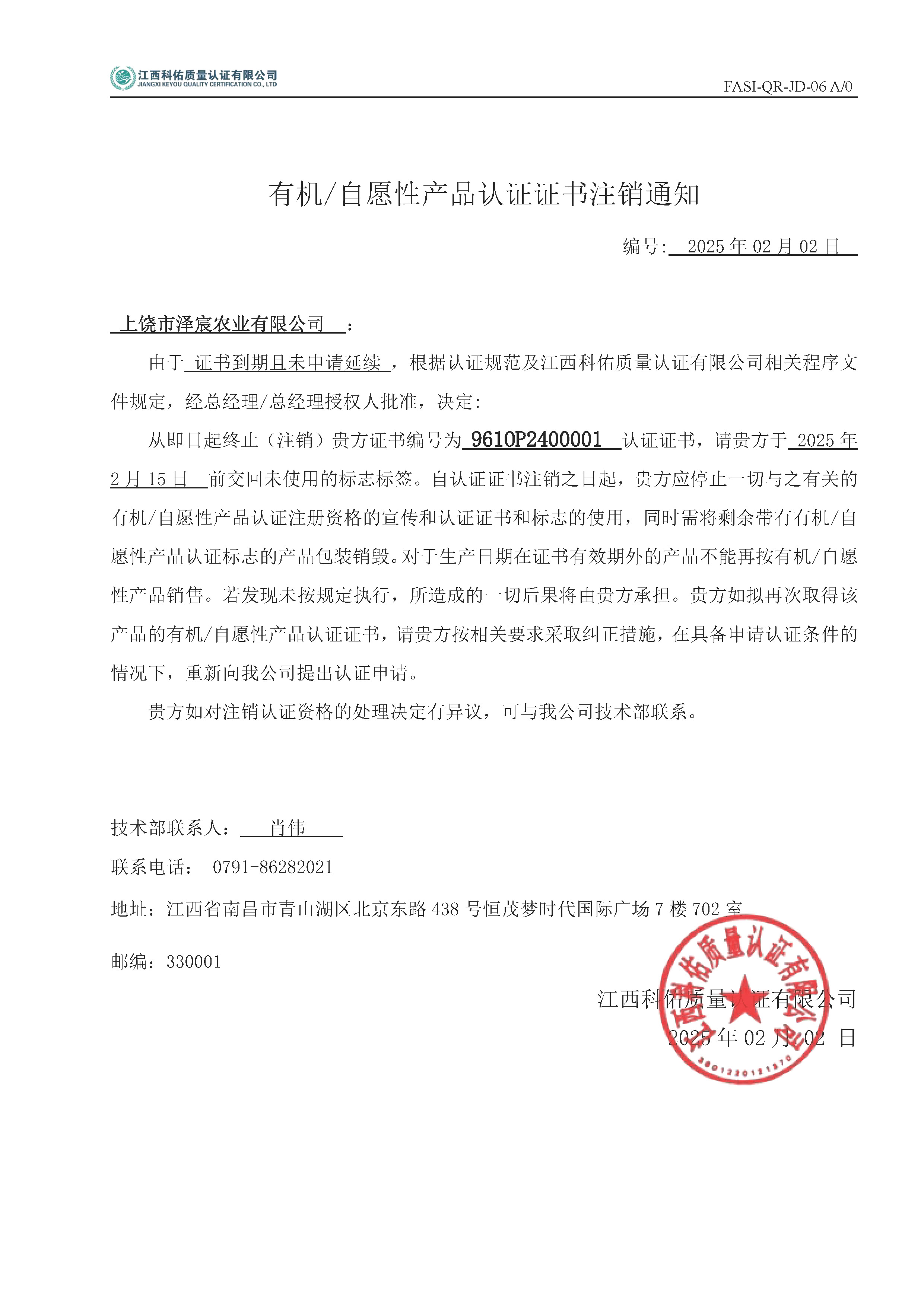 上饶市泽宸农业有限公司 有机证书注销