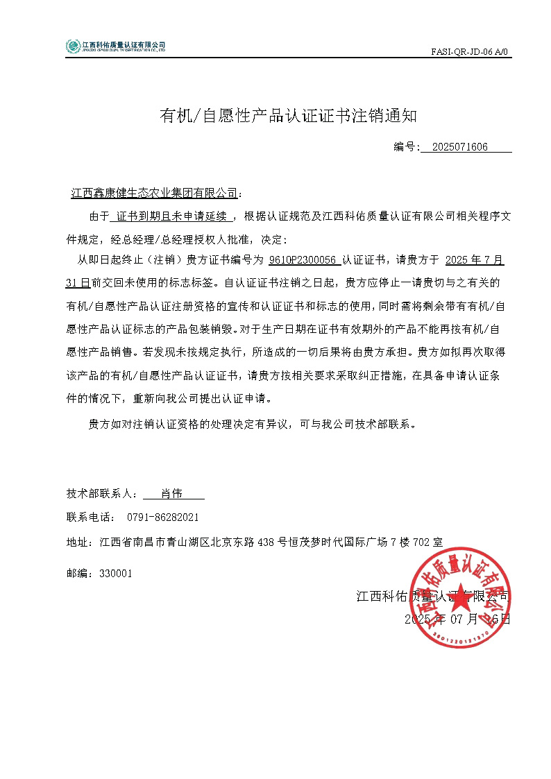 江西鑫康健生态农业集团有限公司有机产品认证证书注销通知