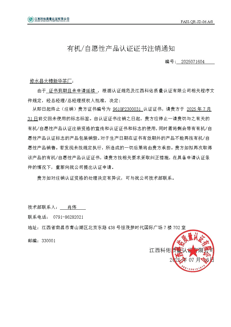 修水县大椿新华茶厂有机产品认证证书注销通知