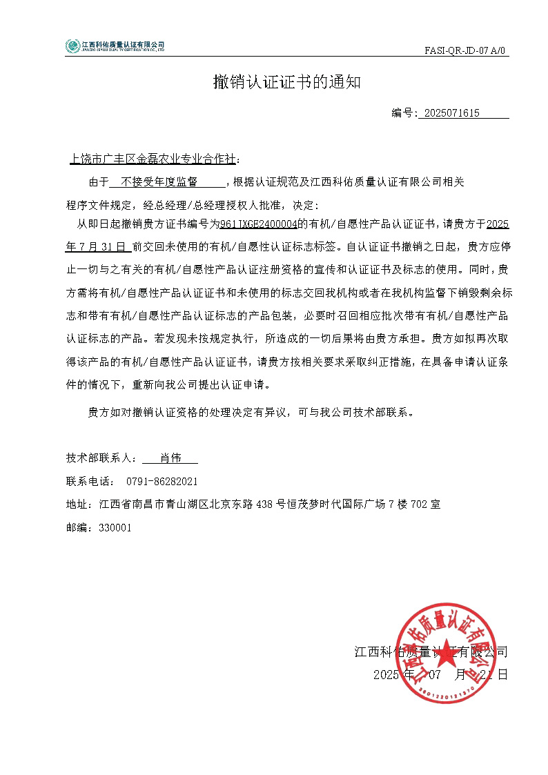 上饶市广丰区金磊农业专业合作社撤销认证证书的通知