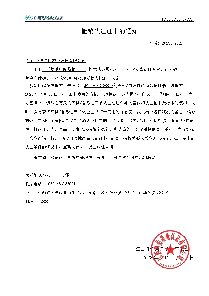 江西爱进特色农业发展有限公司撤销认证证书的通知