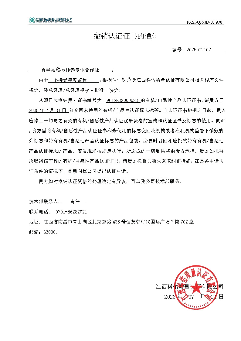 宜丰县欣盛种养专业合作社撤销认证证书的通知