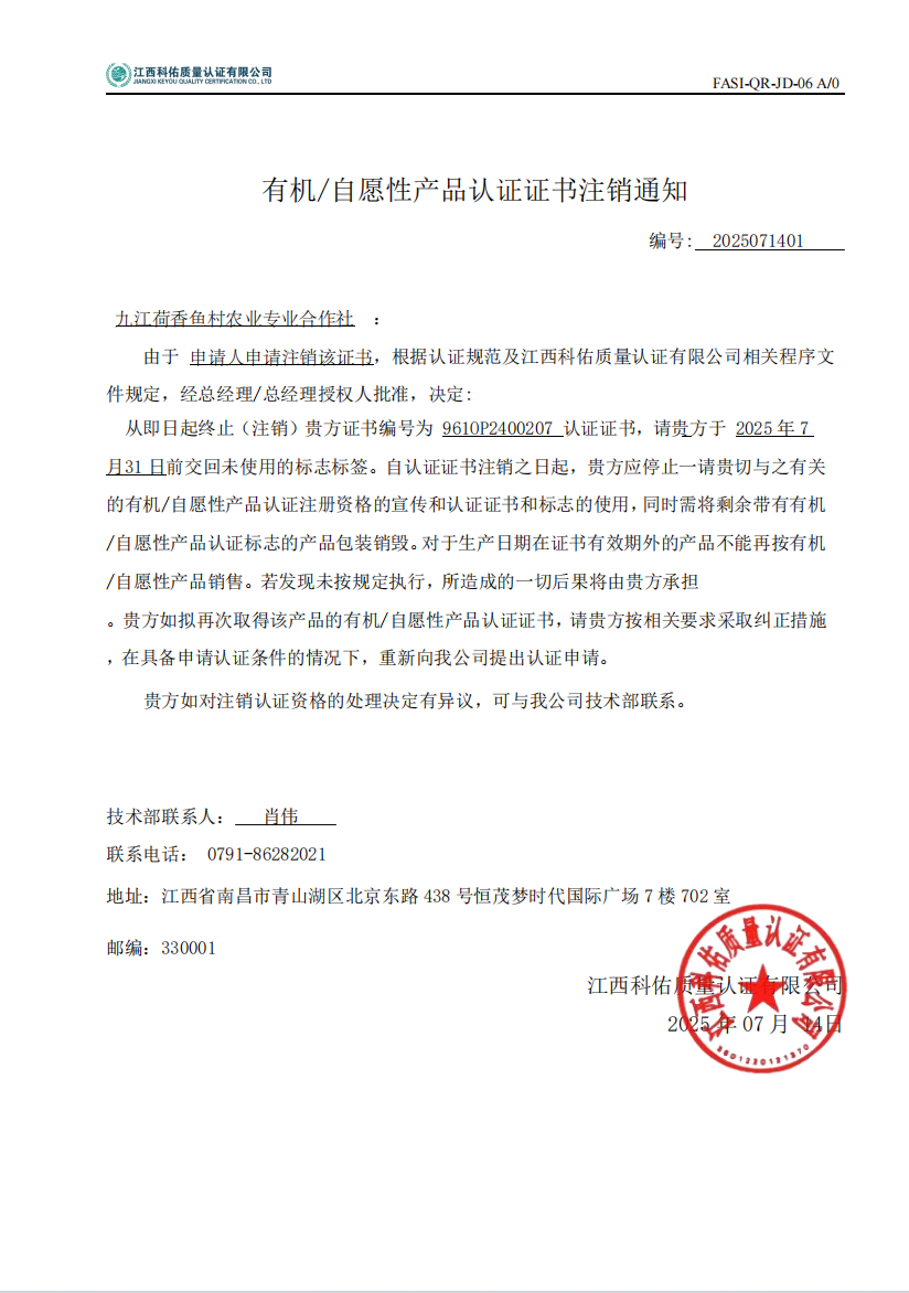 九江荷香鱼村农业专业合作社 有机证书注销