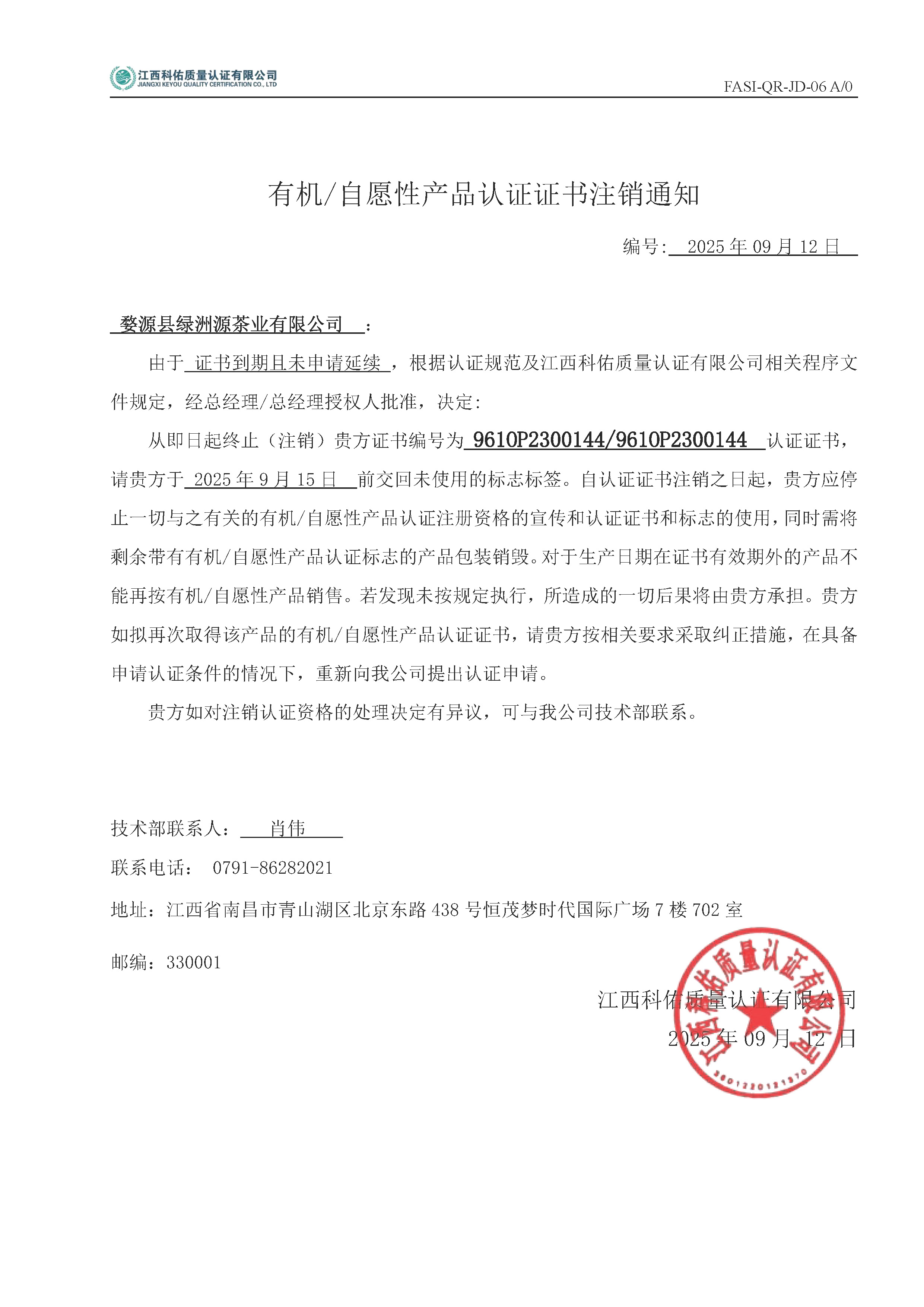 婺源县绿洲源茶业有限公司 有机证书注销